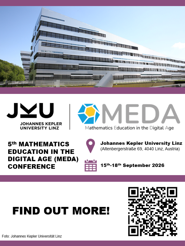 Zu 2) Im September 2026 (15.09.—18.09.) wird die ERME Topic Conference Mathematics Education in the Digital Age (MEDA; https://www.jku.at/linz-school-of-education/news-events/meda2026/) an der Johannes Kepler Universität Linz gehostet. Der Themenschwerpunkt dieser Konferenz ist Mathematics, Technology, Interdisciplinarity. Der Flyer hängt dieser Mail an.